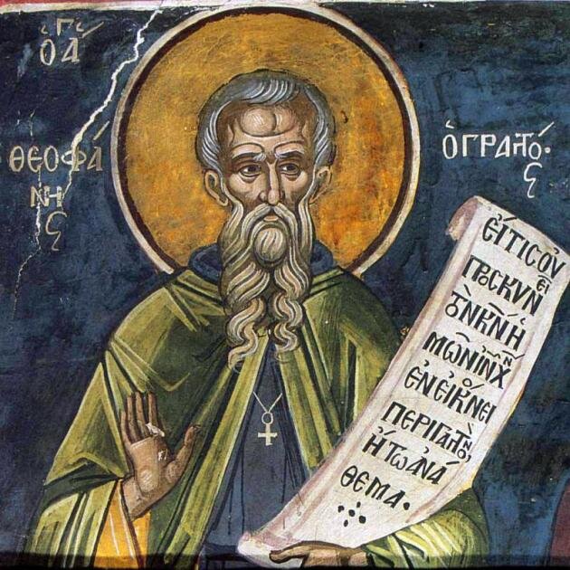 Память прп. Феофана совершается 24 октября. Вместе со своим братом Феодором он также известен под наименованием «Начертанный». Происхождение данного титула станет понятным, если мы кратко рассмотрим жизнеописание святого.
