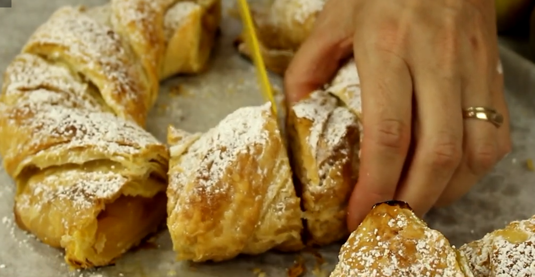 Всем привет, дорогие друзья! Добро пожаловать на мой канал: IRENE FIANDE! Любите ходить по кафешкам и ресторанам? Или может вы обожаете фрукты? Тогда не ленитесь и приготовьте натуральный грушево-апельсиновый пирог ! Вкусно, полезно и без добавок, зато с любовью! Устройте пекарню у себя дома и смело приглашайте гостей! Этот десерт отлично выручит вас, когда нужно накрывать праздничный стол, и если у вас намечается особый ужин. Ингредиенты: Приготовление: 1) Чистим груши и апельсин от кожуры и нарезаем на небольшие дольки, обжариваем на сливочном масле, посыпаем всё сахаром и готовим 5-6 минут до выпаривания смеси. Помещаем всё это в небольшую ёмкость, добавляем ванильный сахар перемешиваем и даём охладиться. 2) На слоёном тесте делаем полоски специальный роликом для пиццы до середины, с конца кладём начинку и заворачиваем в рулет. 3) Ставим рулет на противень и хорошо скрепляем концы, чтоб получилась форма кольца. 4) Отправляем в духовку запекаться при 180 градусах на 25 минут. Как т