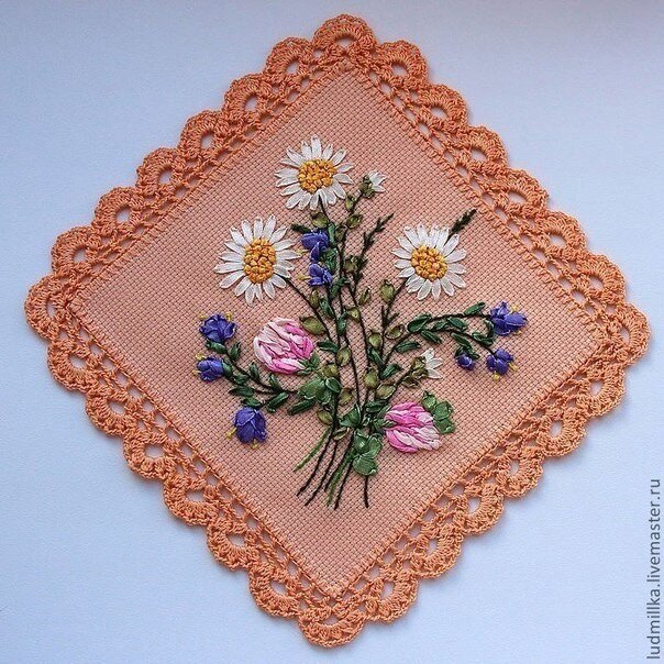 Приветствую Вас, дорогие мои читатели, смотрители и ценители!!!! Все фотографии отобраны на просторах Интернета. Увы, не все авторы работ известны. Древние греки считали, что мастерство вышивки – это дар богини Афины Паллады, которая обучала и поддерживала в творчестве избранных рукодельниц. Многие ценности (творческие) угасшей греческой цивилизации не пропали бесследно. Итальянские мастера Средневековья производили шёлковые ленты для украшения одежды и предметов домашнего интерьера. Для затравочки. Нежнейшие салфетки с простенькими букетами. Только посмотрите, как кружево дополняет работу, гармонизирует ее. Больше всего вышивка лентами приглянулась французской знати. Особы высшего сословия просто обожали коротать время за вышивкой лентами. Постепенно вышивка лентами была приравнена к ремеслу, производство лент и украшений из них было поставлено на поток. Миленькие комбинированные работы. Чудесные девчата. В 18 веке вышивка лентами приобретает грандиозный размах. Комбинируясь