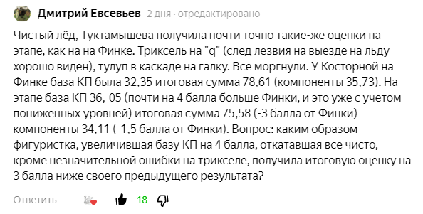 Не стала вчера на эмоциях писать пост о женской одиночке на этапе в Ванкувере. Решила сначала выдохнуть и пересмотреть прокаты, чтобы оценить происходящее. Смотрите, изначально после КП у меня особых вопросов к судьям не было, потому что объективность выданных мест мне кажется честной. Камила безоговорочно первая, Лиза 100% вторая, Алена третья. Мне казалось, что важнее в сложившийся ситуации то, что Алена успешно откатала новую КП, за что мы все дружно переживали, чем пересчитывать баллы и искать потери. Задумалась в эту сторону, когда мне стали писать и возмущаться, что Алене не додали баллов. Потом мне написал комментарий Дмитрий Евсевьев, который вечно умудряется меня ткнуть носом в то, что я не заметила. После его комментариев я все время что-то хожу пересматривать, традиция уже такая :)) Этот раз не был уникальным, я снова пошла пересматривать прокаты и в очередной раз убеждаться, что я ворона :) Выкладываю его коммент для вас, на случай если вы его пропустили. Пересматриваю