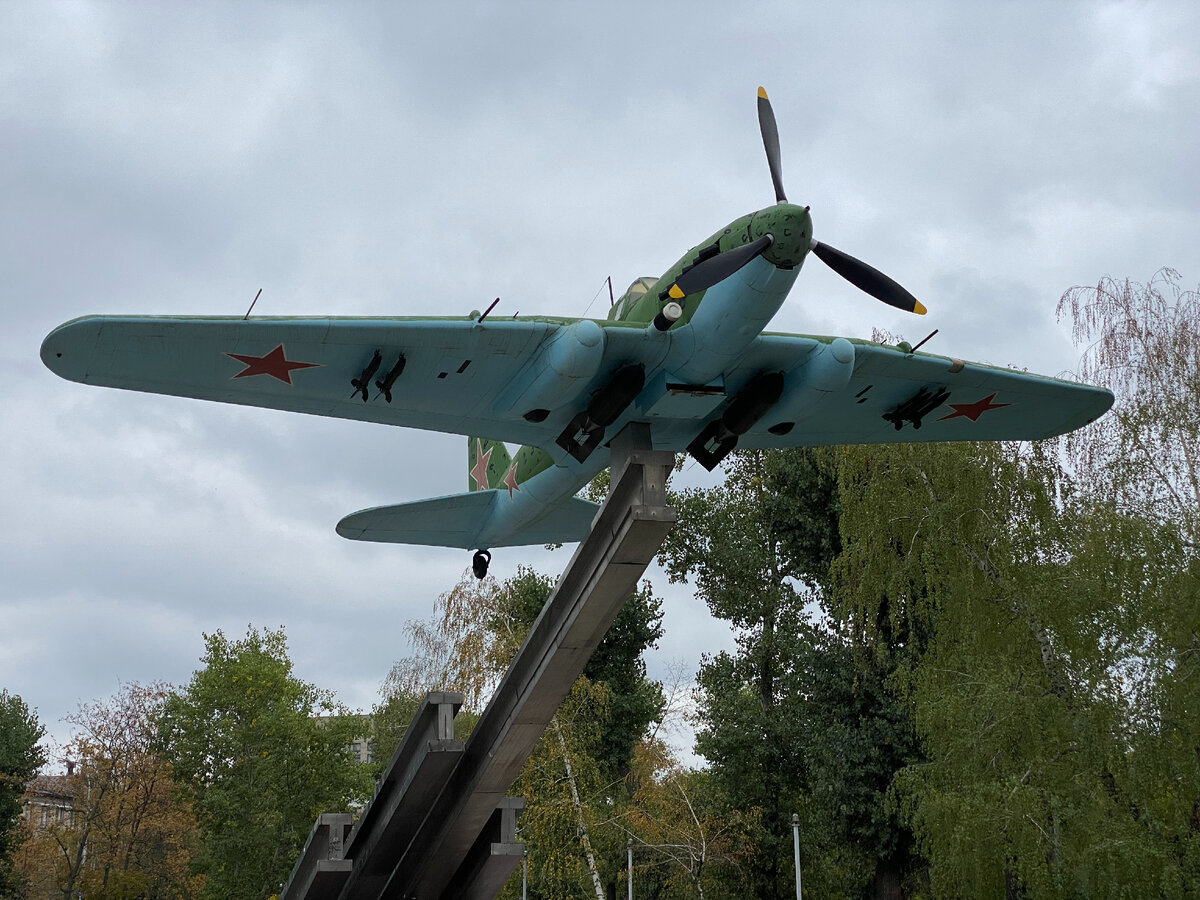 Нечасто удается увидеть в виде памятников настоящие боевые машины. Как правило это либо экспонаты из музеев или складов Министерства Обороны, либо муляжи - новоделы. Но с этим памятником лучшему советскому штурмовику Ил-2 времен Второй Мировой войны всё вышло иначе. Ил-2 до сих пор считается самым массовым боевым самолетом за всю историю авиации, за годы войны было произведено почти 36 тысяч штурмовиков. Про Ил-2 снят не один фильм и сделана не одна компьютерная игра, а фашисты называли легендарный советский самолет не иначе как «Летающий танк» и «черная смерть». Постамент с необычным и как бы взмывающим в небо боевым Ил-2 я заметил у ворот Воронежского Авиационного завода. Именно здесь спроектированный КБ Ильюшина "летающий танк" и начали производить в феврале 1941 года до эвакуации завода в конце 1941 в Самару. Какая же история появления этого боевой "ила" на заводской площади в Воронеже? В 1978 в члены Воронежского поискового клуба «РИФ» узнали о том, что в небольшом поселке Раки
