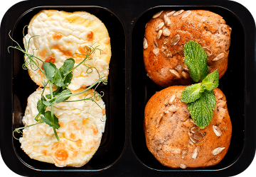 Завтрак 1 31 - жиры, 27 - белки, 50 - углеводы. Омлет с ветчиной и сыром Меланж яичный, молоко 2,5%, ветчина из индейки, сыр моцарелла, специи. Маффины с грушей и грецким орехом Груша, меланж, молоко 2,5%, мука пшеничная, грецкие орехи, корица, семена подсолнечника, масло подсолнечное, сахар, разрыхлитель, соль. Завтрак 2 19 - жиры, 27 - белки, 47 - углеводы. Кесадилья с курицей и овощами Тортилья пшеничная, куриное филе, сыр моцарелла, кукуруза, перец болгарский, базилик, лук, чеснок, перец белый молотый, соль, крем (творог 5%, сыр Креметта, чеснок, соль, продукт, приготовленный по техологии творога). Обед 13 - жиры, 15 - белки, 26 - углеводы. Плов из булгура с курицей Куриное филе бедра, булгур, болгарский перец, морковь, лук, чеснок, кумин, куркума, специи (паприка, кориандр, молотый перец, пряные травы), подсолнечное масло, соль, вода. Полдник 12 - жиры, 5 - белки, 15 - углеводы. Смузи-боул с ежевикой, киви и сублимированными ягодами Крем сливочно-ягодный (креметта, йогурт 3,5%, сл
