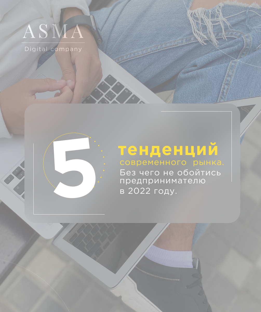 В этой статье мы с помощью графики расскажем о 5 тенденциях, без которых Вашему бизнесу не обойтись в 2022 году. **ну как не обойтись..., жить можно, но мы ведь говорим об эффективности и увеличении прибыли😏 Начнем со вступления:) Кажется, что проще простого, верно? А все так и есть, если вы умеете грамотно делегировать и распределять все необходимые задачи с точки зрения перспективы развития. Обращайтесь к профессионалам и позвольте своему бизнесу вырасти. Остались вопросы? Задавайте их в Директ нашего Instagram-аккаунта:) @asma_digital