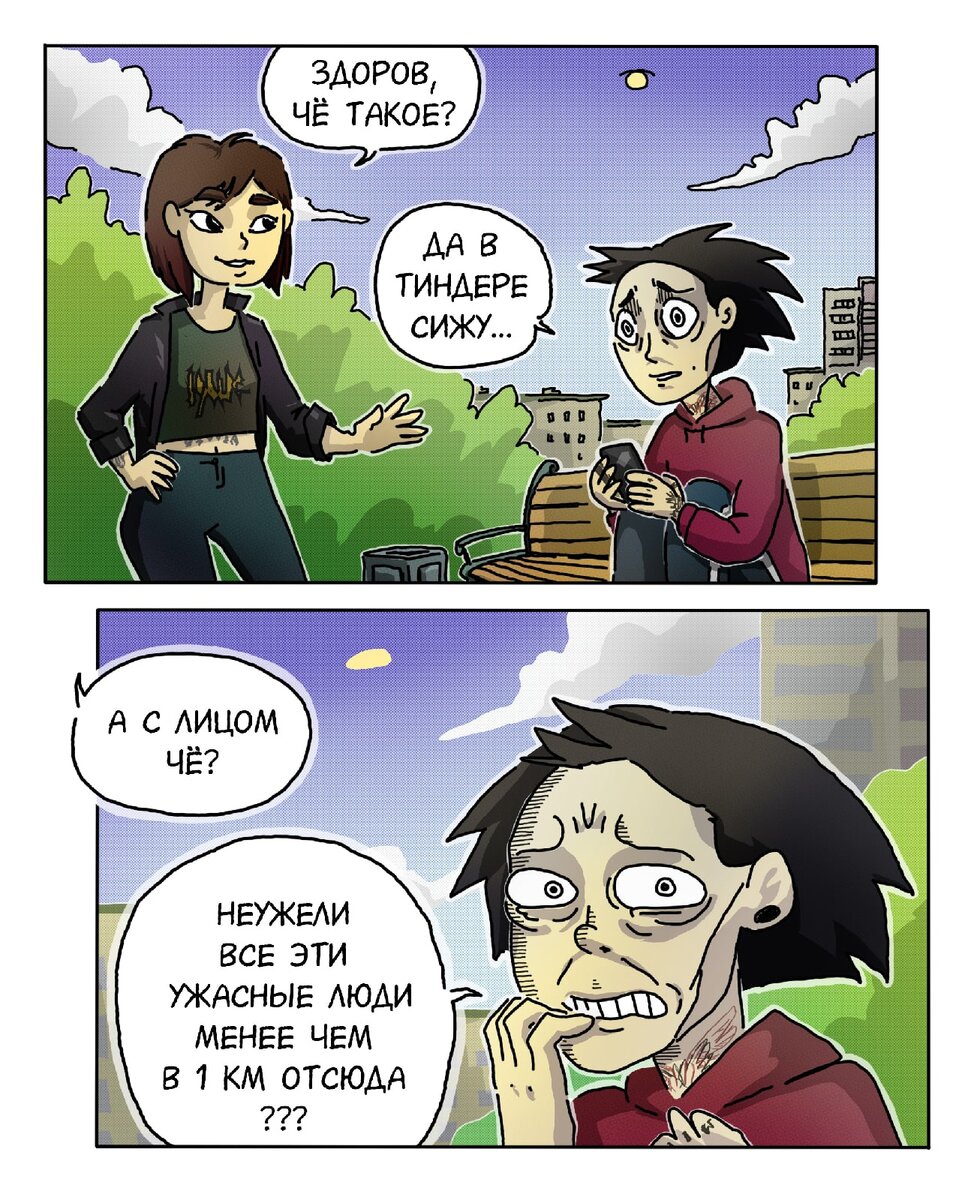 Московская художница под псевдонимом рис создает простые и жизненные комиксы, сюжеты в которых порою граничат с абсурдом. Одну из своих недавних работ она решила посвятить популярному приложению для знакомств, которое, кстати говоря, будет фигурировать во многих комиксах из этой подборки.