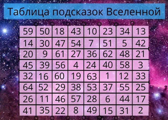 Когда нам предстоит сделать трудный выбор или же мы мечтаем о чем-то, но не знаем, как повернется наша судьба, нам нужен хороший совет и подсказка. Но не всегда мы готовы делиться сокровенными мыслями с посторонними. Предлагаю вам простой и в то же время очень действенный способ получить ответ на волнующий вопрос. Сама вселенная слышит ваши мысли и ведет вас к верному ответу. Загадайте желание или задайте волнующий вопрос. А потом, закрыв глаза, укажите пальце в таблицу с числами ниже. Ответ скрывается под тем числом, куда попал ваш взгляд Несмотря на кажущуюся простоту, эта таблица составлена особым образом, которая дает наиболее точный и верный ответ. ПОЛУЧИТЕ СВОЙ ОТВЕТ. И ПОДЕЛИТЕСЬ СВОИМИ МЫСЛЯМИ!
