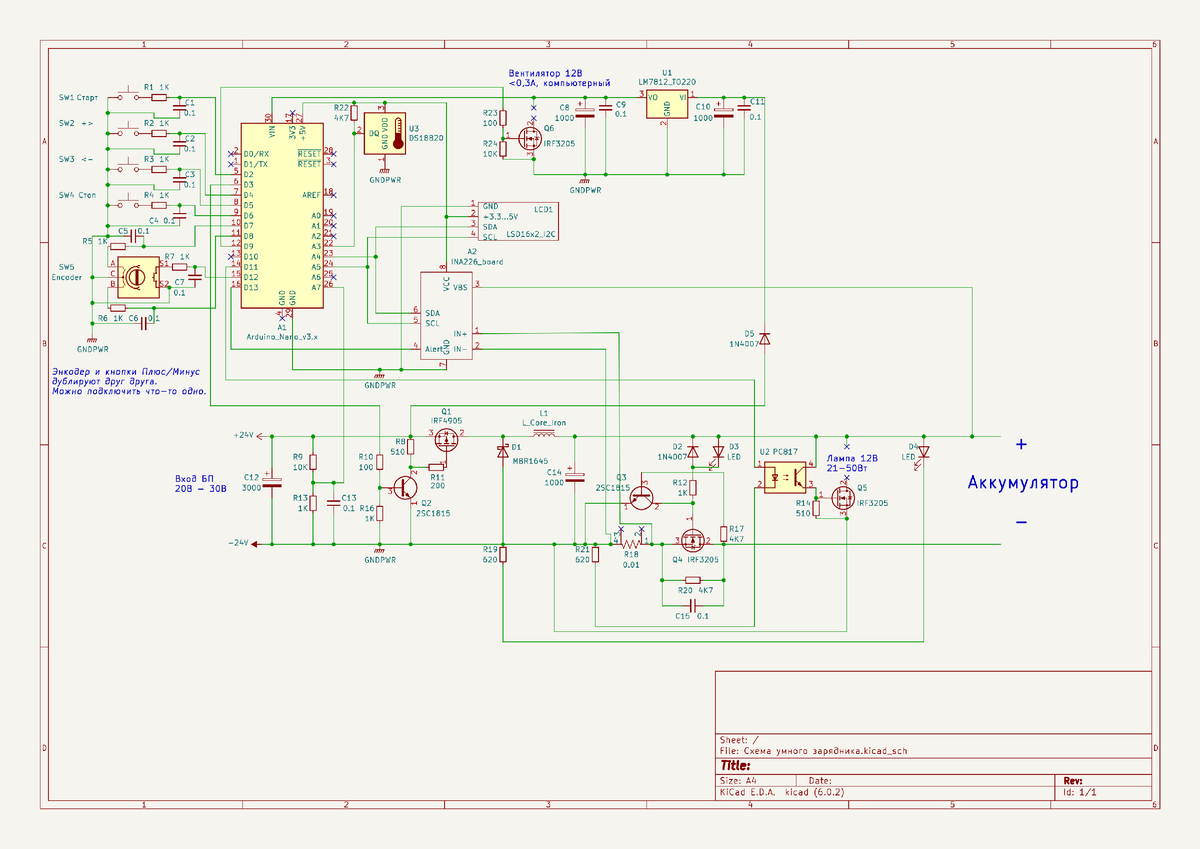 Схема состоит из нескольких модулей. Arduino Nano, INA226 (замер напряжения и тока), кнопки и/или энкодер, стабилизатор напряжения для Ардуино (U1 LM7812), импульсный преобразователь (силовая часть Q1, Q2, L1, D1, С12), защита от переполюсовки и КЗ (Q3, Q4), замер напряжения на входе (R9, R13) и модуль разряда (Q5), измерение температуры зарядника (U3) и управление вентилятором охлаждения (Q6).