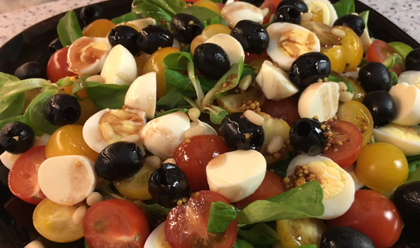 На моём канале уже много рецептов салатов, сегодня набор продуктов минимальный, но тем не менее получился очень вкусный и сытный салат. Итак, начнём... 1. Прежде всего готовим заправку для салата: наливаем в блюдце оливковое масло, добавляем туда горчицу, затем сок лимона и соль. Всё перемешиваем. Откладываем получившийся соус в сторону. 2. Вначале варим перепелиные яйца. Пока варятся яйца, готовим остальные продукты. Приступаем к оформлению. 3. На тарелку выкладываем листья салата. Разрезаем напополам перепелиные яички, которые мы сварили и ложим их на листья. Потом нарезаем напополам помидорки черри, также ложим их на яйца. На помидоры кладём сыр моцареллу. На сыр насыпаем кедровые орешки и на орешки кладём маслины. 4. Заправляем салат соусом, который мы приготовили заранее. По желанию можно украсить зеленью. Обязательно попробуйте приготовить данный салат по этому рецепту, делитесь своими отзывами и не бойтесь экспериментировать! Для салата нам понадобится: - перепелиные яйца – 15
