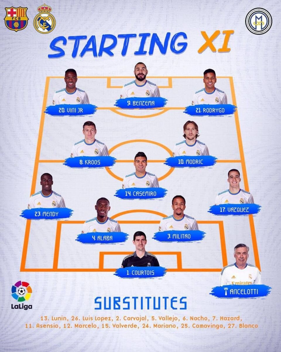Матч между «Барселоной» и «Реалом» прошел в 9-м туре Ла Лиги. «Барселона» - «Реал» 1: 2 Стадионы "Камп Ноу" Голы: 0: 1 - 32 Алаба, 0: 2 - 90 + 3 Лукас Васкес, 1: 2 - 90 + 7 Серхио Агуэро. «Барселона» - тер Стеген, Мингеса (Коутиньо, 46), Пике, Эрик Гарсия, Альба, Бускетс, де Йонг (Серджи Роберто, 77), Гави (де Йонг, 85), Дест, Депай, Фати (Агуэро, 74) . «Реал Мадрид» - Куртуа, Алаба, Милитао, Менди, Модрич, Кроос, Каземиро, Васкес, Бензема, Винисиус Жуниор, Родриго (Вальверде, 72). Предупреждения: Пике (58), Менди (80).