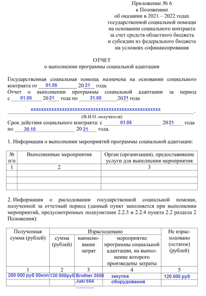 Соцконтракт мне одобрили на шесть месяцев. Буквально через неделю я буду сдавать последний отчет по этой программе. Так получилось, что из за своей общей загруженности на эту тему я так и не написала ни одной статьи. Поэтому сейчас обсудим все и сразу. Первый отчет я сдавала еще до получения всего закупленного оборудования. Поэтому отчитывалась чеками за потраченные средства и совершенно ничего не показывала в доходах. Конечно, на этот момент я уже зарегистрировалась как самозанятая. Но, нет дохода, а значит и нет налога. К отчету приложила распечатку из личного кабинета сайта налоговой, где была видна дата регистрации. Сам отчет выглядит вот так. Всего две страницы. Как видите, ничего супер сложного в этих отчетах нет. Единственное- это маленькие поля для записи. Ну, может это и к лучшему- краткость сестра таланта. В следующие месяцы наименование предприятий у вас будет меняться в соответствии с пунктами вашего бизнес-плана. Например- закупка оборудования (выполнено), пошив витринн