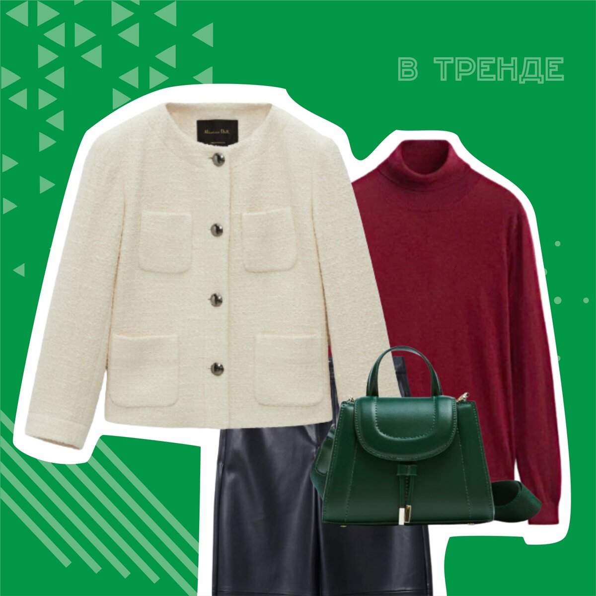 Интересные образы можно собирать не только комбинируя контрастные оттенки, но и сочетая разные фактуры. Осенью актуальны вещи из эко-кожи. Они достаточно практичные, особенно когда на улице мокрый снег и слякоть. Поэтому базой для осенней капсулы стали брюки и юбка из эко-кожи. С чем сочетаем? Выигрышно гладкие фактуры смотрятся с рыхлыми и мягкими. Поэтому для капсулы отлично подойдет жакет в стиле Шанель. Его можно комбинировать с блузой, джемпером или тонким свитером, если стоит задача собрать образ в кэжуал стиле. На более сухую погоду можно взять прямые брюки из денима. Для выходов в свет в капсуле предусмотрены роскошные удлинённые брюки из бархата. Что касается оттенков, то преобладают базовые: кремовый, черный и тёмно-синий. В качестве ярких цветовых пятен использованы красный и зелёный. Это достаточно контрастное сочетание, но в большинстве образов оно используется дозировано. Осенняя капсула Состав капсулы: 1. Кардиган H&M 3999 руб. 2. Жакет Massimo Dutti 15 990 руб. 3. Пиджа
