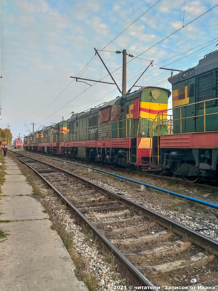 Сегодняшний обзор - вновь некоторое виртуальное путешествие по железным дорогам России. В том смысле, что сегодня не мои фотографии, а присланные. И я, признаться, немного даже растерялся, так как название обзора никак не придумывалось. Дело в том, что сегодня в обзоре фотографии тепловозов сделанных на станции Грязи. А пояснений в письме, к сожалению, не было. В итоге в голову лезли всякие дикие вещи вроде "Грязных тепловозов" и "Из Грязи тепловозы". Чушь! В итоге пришел вот к такому "консенсусу" (как любил говаривать один неприятный политик) который обозначился в заголовке. И сегодня просто тепловозы: снаружи, а в конце и немного в кабине. 1. Начнем с такого любопытного состава (или все же сплотки?) - пять маневровых тепловозов серии ЧМЭ3. С одной стороны... 2. ... и с другой стороны. 3. Еще один маневровый сфотографирован отдельно. Перед нами ЧМЭ3т-6647. 4. И такой же тепловоз, но с "красивым" номером 3400 внутри депо, на обслуживании. 5. Кроме маневровых, можно встретить и магистр