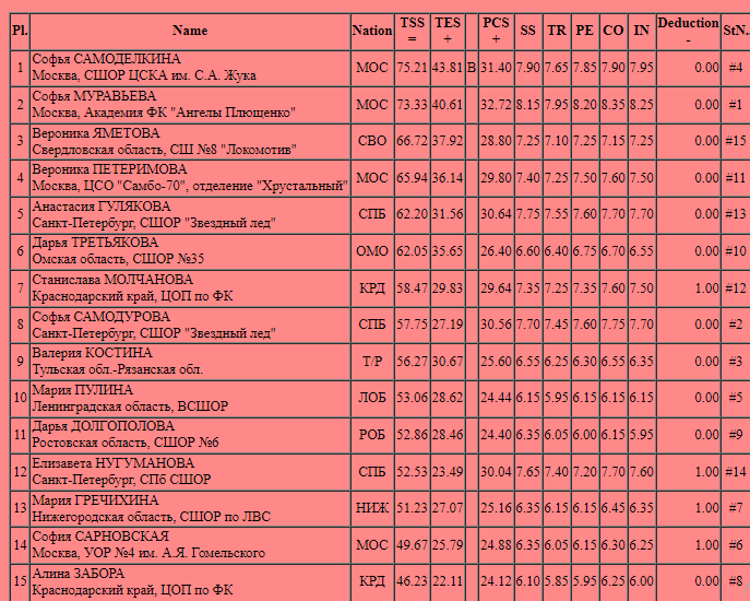 Софья Самоделкина в прокате короткой программы смогла исполнить тройной аксель. Выезд правда был не самым уверенным, но вроде бы без недокрута. За исполнения акселя фигуристка получила дополнительный бонус. Далее, Софья исполнила сольный 3Ф и каскад 3Л+3Т. На дорожке шагов была допущена небольшая помарка.