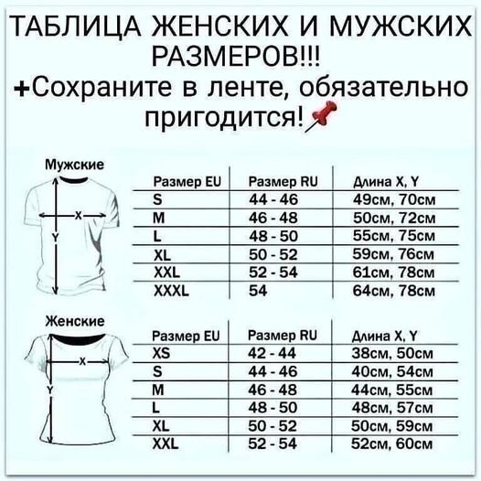 Таблица женских и мужских размеров.