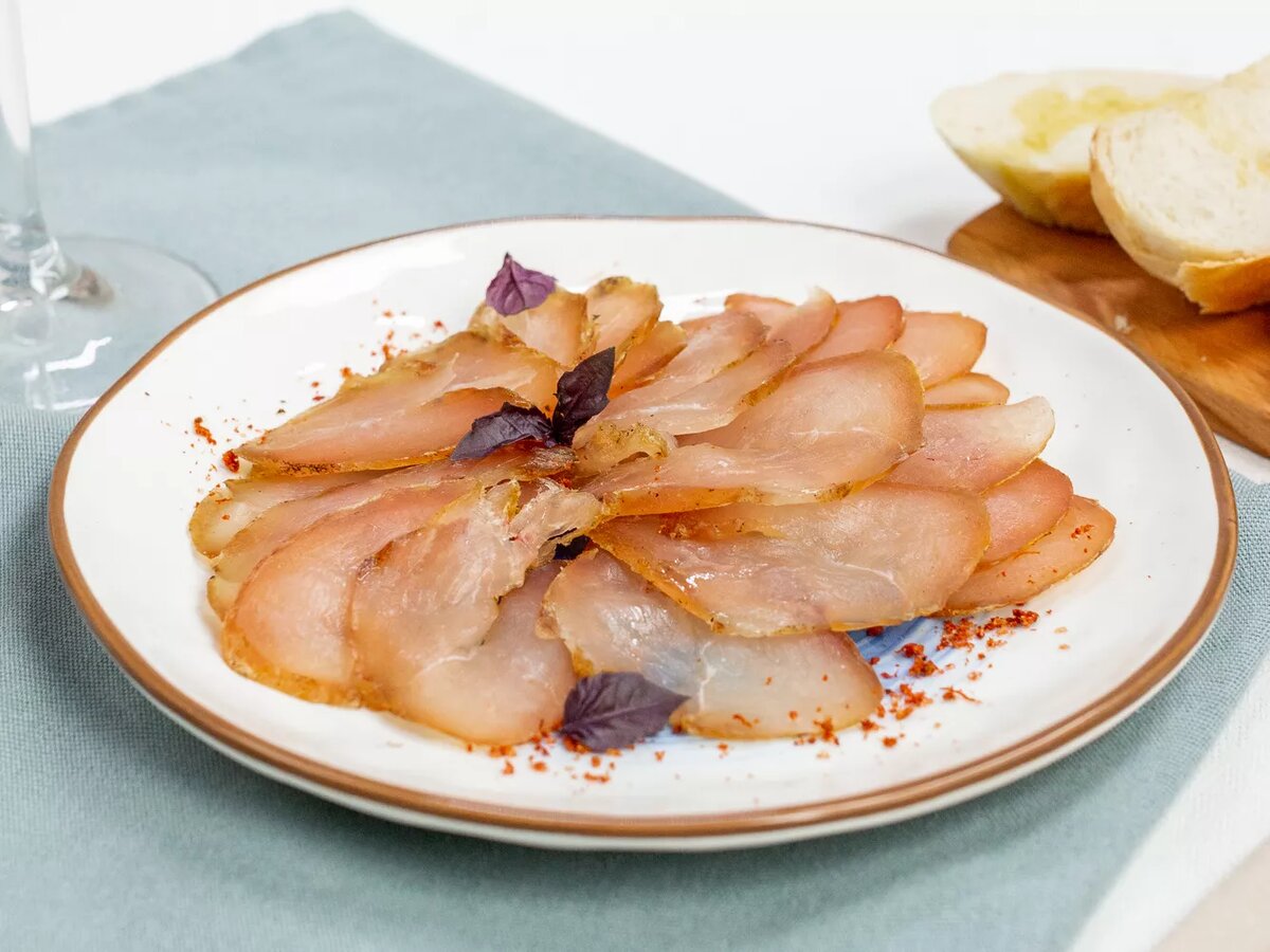 Балык — вкусное и питательное блюдо из вяленого мяса, которое полезно тем, что не подвергается термической обработке. Приготовить диетический балык можно из куриной грудки. Благодаря своей нежной текстуре филе птицы легче поддается маринованию и вялению. Еще один плюс этого рецепта — готовится курица в холодильнике, а не при комнатной температуре. Для приготовления важно выбирать охлажденную грудку с плотной структурой и светло-розового цвета. Пошаговый фоторецепт: Подготовьте продукты для балыка из куриной грудки. Мясо тщательно помойте, обсушите бумажным полотенцем. Удалите жир и жилы. Куриную грудку разделите на 2-3 больших куска. Совет: Не пугайтесь количества соли. Балык пересолить невозможно, так как мясо впитает столько соли, сколько нужно. Остальное останется на поверхности. Куриную грудку замаринуйте. Соедините в миске соль, смесь перцев, орегано, мускатный орех, куркуму и коньяк. Посыпьте мясо со всех сторон смесью для маринования. Уложите грудку в контейнер, сверху разместит