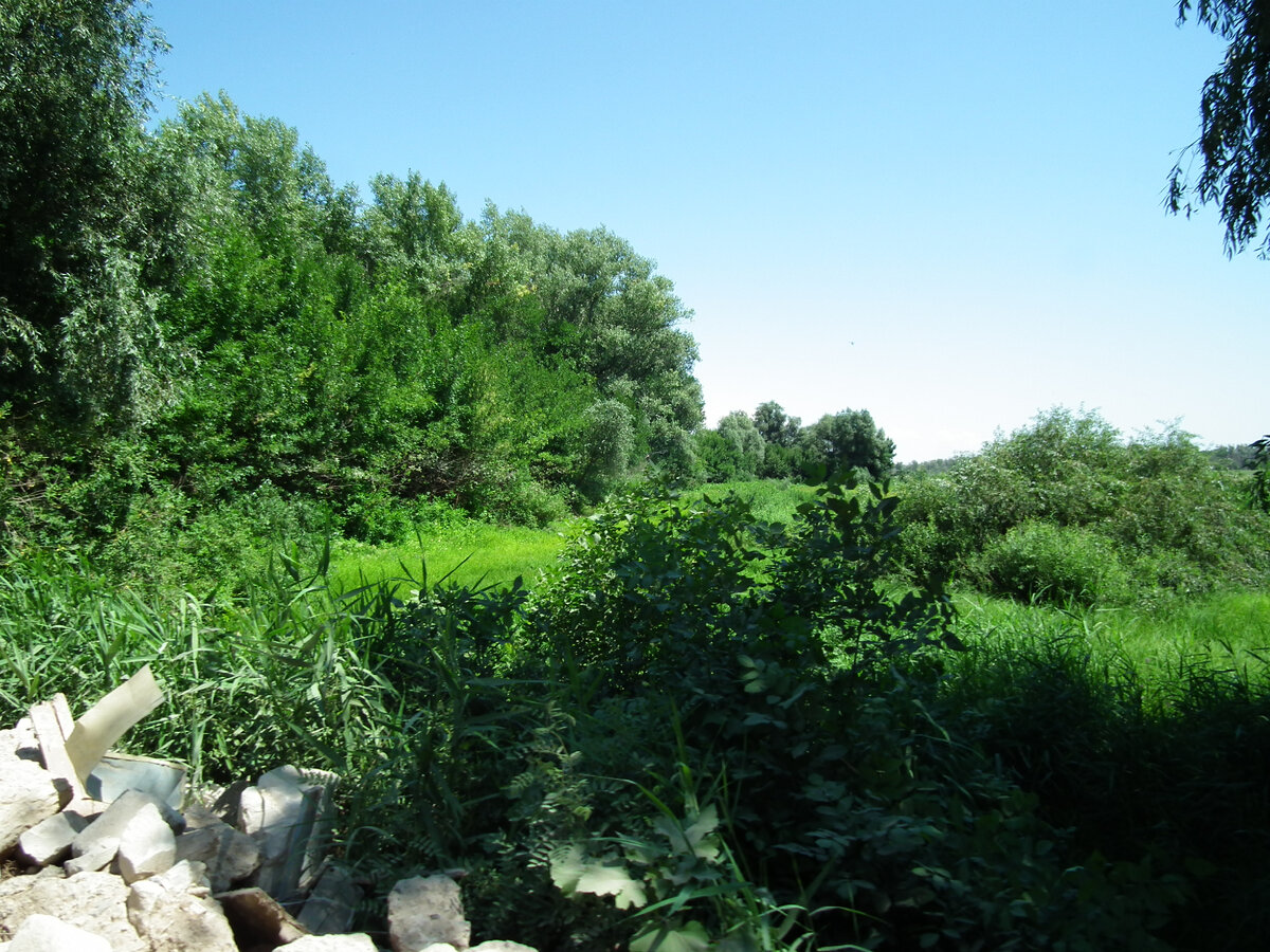 В Среднеахтубинском районе Волгоградской области есть хутор Красный Сад. Расположен на правом берегу реки Ахтуба. Население - 870 человек (многовато, на мой взгляд, для хутора). Это довольно тихое место. До райцентра, рабочего посёлка Средняя Ахтуба, от Красного Сада по прямой километра два, не больше. Но это по прямой - через Ахтубу и пойменный лес. А вот по дорогам получается уже около десяти. И это играет свою роль, здесь намного меньше отдыхающих, здесь более тихие места и чистый берег. Если возле Лебяжьей Поляны я бывал много раз, то в районе Красного Сада был лишь однажды, в июле 2012 года. Все фотографии в этой статье сделаны во время той поездки. Дорога в хутор Красный Сад идёт через посёлки Куйбышев и Первомайский, пересекает ерики Кривой и Бугроватый. Живописные места, утопающие в зелени. Был конец июля, но луга ещё были покрыты сочной зеленью. Проехали Первомайский, перемахнули по мосту ерик Бугроватый. Половодье давно прошло, но воды в нём было ещё много. Мост через ерик Б