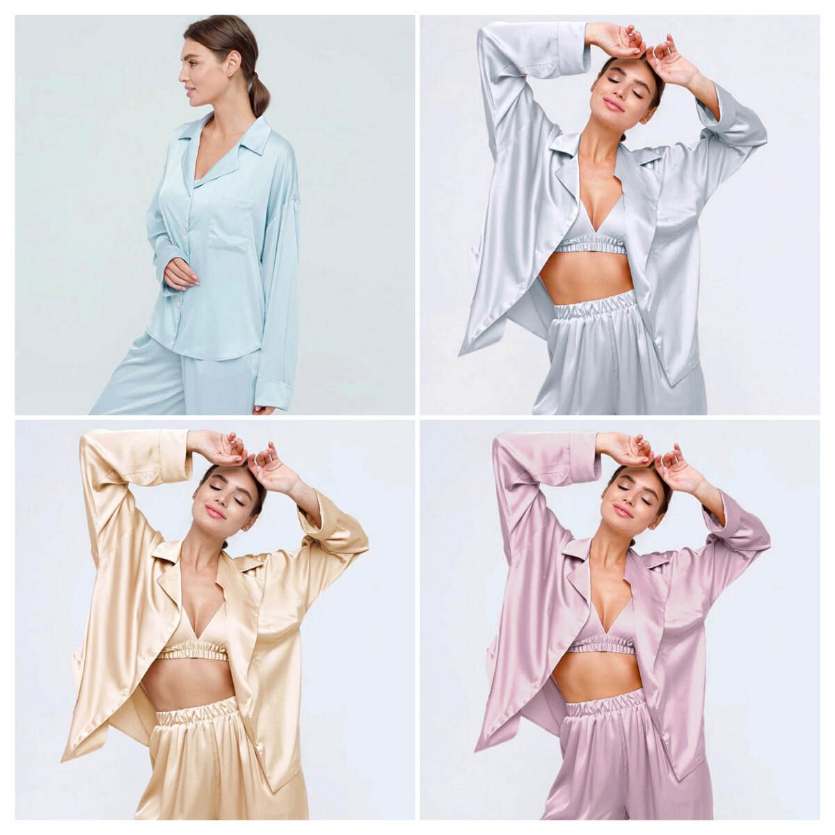 Всем ремонт, мои домашние! Как-то я уже делала подобную подборку домашней одежды совместно со стилистом и Ламодой. Сегодня решила сама поискать интресные варианты, но уже с другого сайта. С АлиЭкспресс. Последнее время мне всё чаще кажется, что нет абсолютно никакой разницы в покупке некоторых вещей на алике и в магазинах. Все "модные" шоурумы продают такую же одежду, что и известная площадка из Поднебесной. Так что разницы большой не вижу. К тому же я с недавних пор смотрю канал Кати Конасовой на Ютубе и нахожу этому подтверждение. Атласная пижама Первой в подборке будет вот такая классная атласная пижама. Средняя оценка 4,6, по отзывам — всем нравится. Большинство рассматривает ее как домашний костюм, а не пижаму для сна. Поэтому я ее и включаю в подборку одежды для дома. Кто-то писал в отзывах, что здорово использовать такие пижамы для фотосессии. Идеально для свадебной. Сделала коллаж из некоторых фото из отзывов. Кому понравилась пижамка, оставлю ссылку. Комплект из двух предм