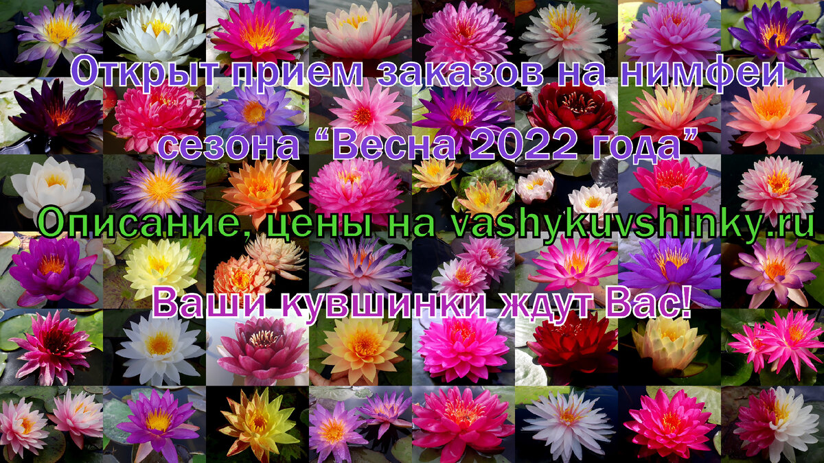 Дорогие друзья, коллеги рад объявить Вам об открытии приема заказов на нимфеи сезона "Весна 2022 года". Основные условия: заказ на сумму не менее 2500 рублей, аванс при фиксации 25% по классическим зимостойким и 50% по isg (hxt) зимостойким сортам, оплата остатка и расходов по доставке перед отправкой весной. По 95% сортов на сезон снижены цены или действуют акции, что делает ещё доступнее их приобретение. Все цены, описание, фото, видео на сайте https://vashykuvshinky.ru Количество ограничено. Ваши кувшинки ждут Вас!
