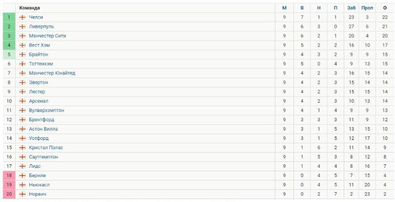 Чемпионат англии, Английская Премьер Лига (АПЛ) после 9 тура.