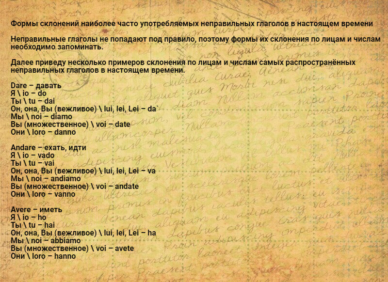 Неправильные глаголы не попадают под правило, поэтому формы их склонения по лицам и числам необходимо запоминать. Далее приведу несколько примеров склонения по лицам и числам самых распространённых неправильных глаголов в настоящем времени. Dare – давать Я \ io – do Ты \ tu – dai Он, она, Вы (вежливое) \ lui, lei, Lei – da` Мы \ noi – diamo Вы (множественное) \ voi – date Они \ loro – danno Andare – ехать, идти Я \ io – vado Ты \ tu – vai Он, она, Вы (вежливое) \ lui, lei, Lei – va Мы \ noi – andiamo Вы (множественное) \ voi – andate Они \ loro – vanno Avere – иметь Я \ io – ho Ты \ tu – hai Он, она, Вы (вежливое) \ lui, lei, Lei – ha Мы \ noi – abbiamo Вы (множественное) \ voi – avete Они \ loro – hanno Essere – быть, есть, находиться Я \ io – sono Ты \ tu – sei Он, она, Вы (вежливое) \ lui, lei, Lei – e` Мы \ noi – siamo Вы (множественное) \ voi – siete Они \ loro – sono Fare – делать, готовить Я \ io – faccio Ты \ tu – fai Он, она, Вы (вежливое) \ lui, lei, Lei – fa Мы \ noi