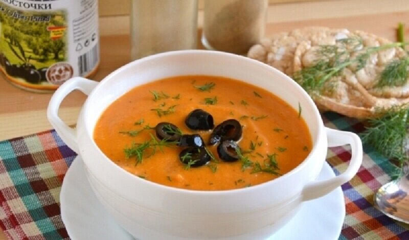 Замороженная смесь "тыквенный суп" - 450 г Лук репчатый - 200 г Чеснок - 30 г Томатный соус - 60 г Масло оливковое - 30 мл Молоко 0,5% - 180 мл Перец чили (порошок) - 1/3 ч.л. Чесночный перец - 1/2 ч.л. Сушеные травы - по вкусу Соль - по вкусу Маслины - по желанию Зелень - по желанию Хочу поделиться рецептом быстрого овощного супа-пюре, с которым я очень люблю проводить разгрузочные дни. В одной порции такого супчика содержится всего 60 калорий, а острота перца чили, входящего в состав, помогает разгонять обмен веществ так, что скинуть лишний килограмм за один день не составит большого труда. К тому же суп очень вкусный и ароматный. Для приготовления диетического острого томатно-тыквенного супа подготовьте продукт по списку. На оливковом масле обжарьте лук вместе с томатным соусом и специями. Должна получиться золотистая томатно-овощная поджарка. Овощи, не размораживая, выложите в кастрюлю. Добавьте поджаренный лук и влейте молоко. Доведите до кипения и варите на среднем огне 10 минут.