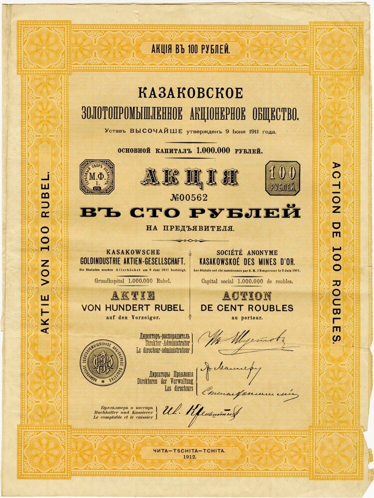 Ценные бумаги. Взгляд в прошлое. Казаковское золотопромышленное акционерное общество.