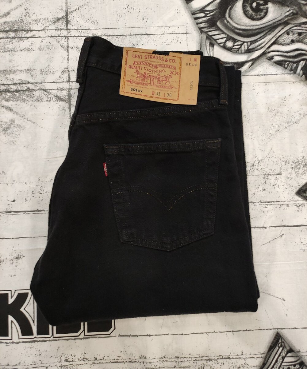 Джинсы Levi's 501xx. Джинсы прямого кроя, со средней посадкой,со стандартной штаниной на болтах. 501 – это модель изначально мужская, эталон классических прямых джинсов. Производство USA. Демин тёмного, чёрного цвета, почти не тянется, т. к. состав на бирке 100 % хлопок, без вкрапления дополнительных тканей и материалов. Ткань очень плотная, слегка шершавая на ощупь. На лицевой стороне хорошо прощупывается её текстура. Это вызывает чувство, будто новая пара джинс уже была в эксплуатации. На европейских моделях ткань гладкая и приятнее на ощупь. Таб красного цвета с буквой "R",вшитый в задний карман. Жакрон из материала похожего на плотный картон. На нём указан размер, модель, и производство. До этой модели я не встречал такую надпись. Швы на арке выполнены аккуратно в одну нить, цвет ниток отличается от других декоративных, которыми прострочена вся пара. Клёпки медные с гравировкой лейбла и модели. На болте тоже имеется гравировка, с внутренней стороны выбит серийный номер 653, котор