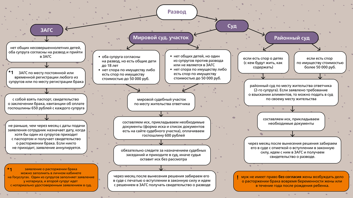 Когда супруги хотят развестись, часто возникает вопрос как это сделать. Разбираемся! 📌Путь через ЗАГС: Оба супруга приняли решение о разводе, у них нет общих несовершеннолетних детей. Идете в ЗАГС по месту постоянной или временной регистрации любого из супругов или по месту регистрации брака, совместно в ЗАГС подаёте заявление о разводе. При себе иметь: паспорт, свидетельство о заключении брака, квитанцию об оплате гос пошлины (650 рублей с человека). Свидетельство о расторжении брака будет готово спустя 1 месяц с дня подачи заявления о разводе. Необходимо явиться хотя бы одному из супругов за свидетельством о расторжении брака, иначе ваши заявления будут аннулированы. 📌Путь через СУД: Второй супруг против развода или он уклоняется от явки в ЗАГС; также если у супругов есть несовершеннолетние дети и/или спор по имуществу. 🔸В МИРОВОЙ СУД, если: нет спора по имуществу или спор по имуществу не превышает 50 000 рублей. Составляем иск, прикладываем документы, оплачиваем гос пошл