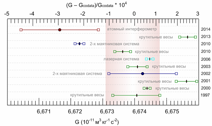 Со школьной скамьи большинство из нас знает о существовании такой фундаментальной физической константы как гравитационная постоянная или постоянной Ньютона. Гораздо меньше людей смогут вспомнить, хотя бы приблизительно, величину этой константы. И практически никто не сможет дать её физическое толкование. И дело здесь вовсе не в плохом усвоении школьного материала. Просто современная наука пока не в состоянии объяснить природу этой постоянной. Более того до сих пор не известно её точное значение. На сегодняшний день погрешность вычисления G составляет тысячные доли процента. При этом измерения, проводимые различными группами исследователей, дают сильно различающиеся результаты. Этот факт подтверждается приведённой ниже диаграммой и подталкивает к мысли, что гравитационная константа не такая уж и константа, а скорее переменная.