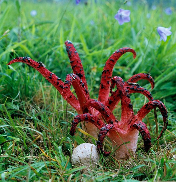 Пошел собирать грибы, а нашел поляну цветов. Видимо-невидимо. Аленькие такие. Только как-то странно пахнет Этим необычным творением природа еще раз доказывает, насколько она разнообразна, непредсказуема и гениальна. Сегодня мы расскажем о грибе, который необыкновенен с самого момента своего появления. Он вылупляется из яиц. И происходит это как в том фильме ужаса, когда скорлупа вдруг затрещала и раскололась, и из нее медленно начинают вылезать красные щупальца. В этом зрелище есть действительно что-то жуткое. Поэтому и название гриб получил соответствующее – пальцы дьявола. Вылупившись, красная рука активно тянется вверх, выпрямляя свои пять пальцев и превращаясь в раскрытую ладонь. Сами пальцы покрыты слизью, притом запах разносится очень неприятный. Его сравнивают с гниющим мясом, ух… Запахом он приманивает мух. Плотоядный, он ими питается. Или, смочив их обильно своей слизью, может отпустить на волю – для распространения спор. Живет гриб не долго, около двух суток. Затем засыхает,