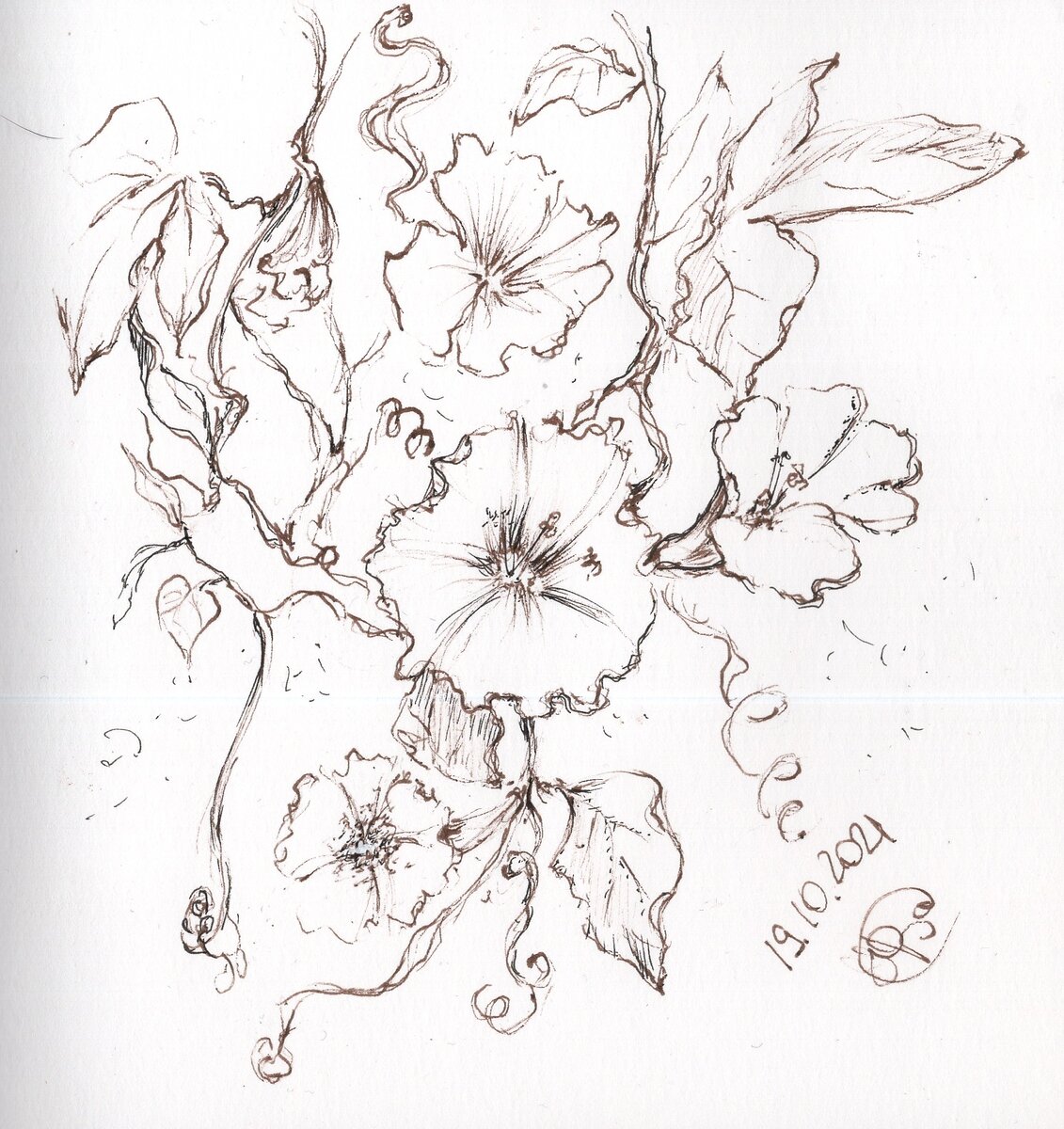 Именно на этот день "наступил" момент, когда то, что очень хочется изобразить - не получается изобразить. И так тоже бывает. А 19/31 это слово #спираль . И сначала мне хотелось нарисовать что-то концептуальное с скрипичным ключом, всполохами белых искр бумаги и нотами. Но ничего не получилось, кроме невнятного ключа. Так тоже бывает и это абсолютно нормально. Подумав еще над заданной темой, я решила нарисовать вьюнок. Ведь в этом цветке тоже есть спиралевидные усики, стебли. И просто он красивый. А по альтернативному списку слова #спираль и #руна . Не могу сказать, что справилась, но это тоже опыт. И да, с руной точно справилась. Их там есть три даже, а может и четыре можно разглядеть.