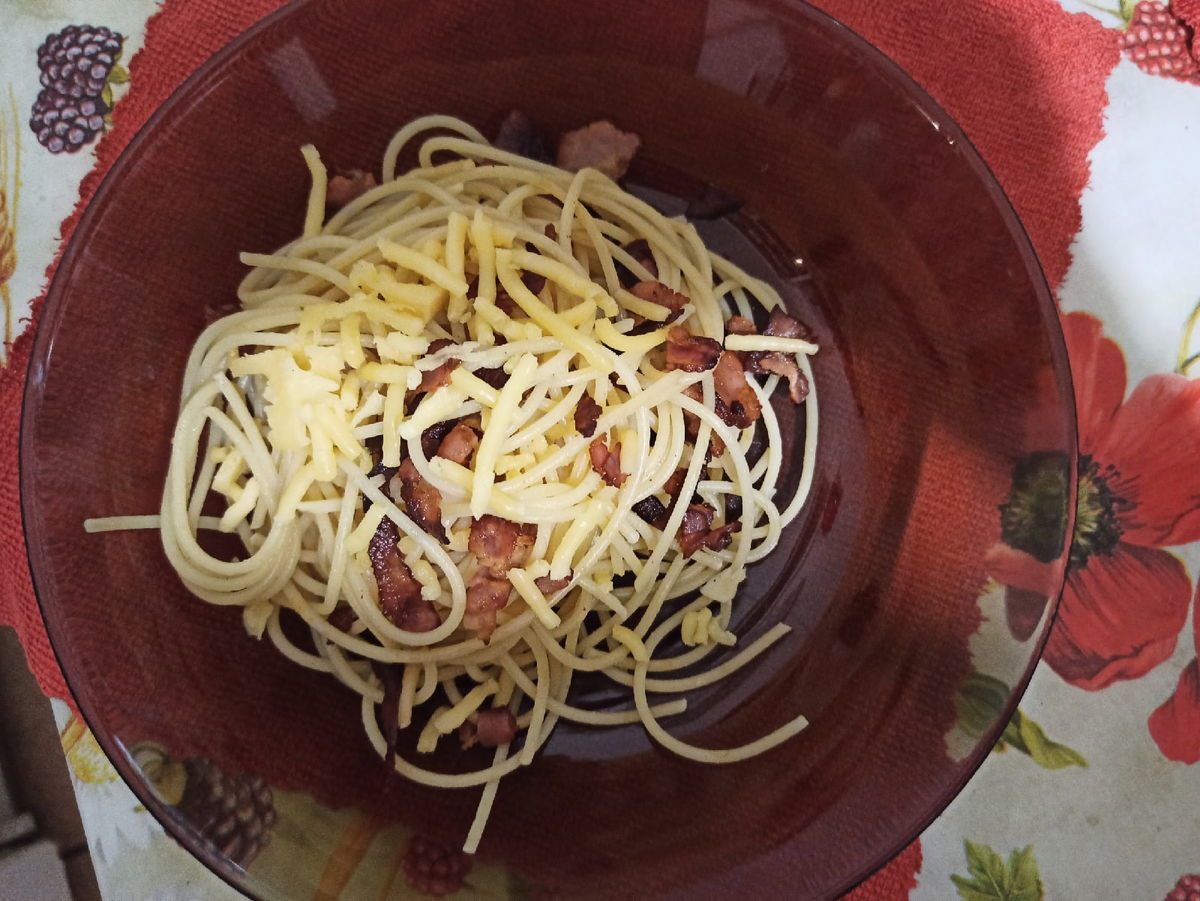Всем привет! Это Дмитрий Строитель! Люблю вечером сытно поесть на ночь и так, чтобы со шкварками! Тут меня спасает мой любимый бекон! Бекон у меня всегда хранится в холодильнике. Обычно я им закупаюсь по акции в супермаркете. Еще я по акции всегда запасаюсь спагетти. Для моего дежурного блюда потребуется немного твердого сыра, который у меня всегда хранится в холодильнике или морозильной камере (если я по акции взял его слишком много, то замораживаю). Берем бекон и спагетти (я их упаковки не фотографирую и здесь не выкладываю, чтобы не рекламировать продукцию). Бекон мелко нарезаем и обжариваем на сковороде, чтобы хрустел. Отвариваем спагетти в кипящей подсоленной воде в течение 8 минут. Выкладываем спагетти на большое блюдо. В готовые спагетти выкладываем бекон, перемешиваем.