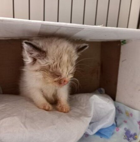 Ветеринары гарантий никаких не давали спасти зрение, речь шла только о спасении жизни, потому что организм котенка был настолько поражен сильными инфекциями, что каждый день был как последний. Булочка не могла поднять свое маленькое тельце, чтобы ходить и самостоятельно есть, она просто лежала без движения. Но мы тогда не знали, что в ней огромнейшая тяга к жизни. Маленькая, истощенная крошка и какая огромная сила оказалась в ней!!! Несколько дней, с начала интенсивного лечения, в стационаре Перми, Булочка выглядела только так. Ее братику Кирюше было легче, хотя болел он так же сильно. Да и глазки его не были так сильно инфицированны, хотя на их спасение тоже ушло немало сил. История малышей в статье "Малышей стремительно поглощает тьма" и "Половина пути пройдена, будет ли вторая?" Пока боролись за жизнь Булочки, Кирюша медленно, но верно начал идти на поправку. Он становился все краше и краше, пузатее и пузатее. Кормили и ухаживали за котятами хорошо. И по прошествии ровно одного ме
