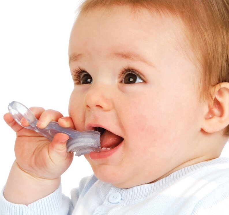 Вначале, пока прорезаются только резцы, мы можем чистить только влажной марлей или тканевым носовым платком - просто протирать поверхность зубов.