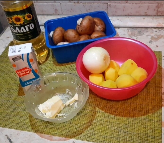 Добрый день, уважаемые читатели! Сегодня хочу поделиться с вами рецептом картофельного супа-пюре с жареными грибами. Нам понадобятся: Картофель необходимо очистить и нарезать мелкими ломтиками. В кастрюле растапливаем сливочное масло (огонь делаем небольшой, чтобы масло не пригорело). Высыпаем нарезанный картофель в кастрюлю и прижариваем на растопленном масле до золотистой корочки. Лук тоже мельчим. Добавляем лук к картофелю и продолжаем обжаривать до золотистого цвета, постоянно помешивая. Затем наливаем в кастрюлю воды в соотношении примерно 1:1. Варим картофель до полной готовности. В это время нарезаем грибы. Обжариваем грибы на сковороде, добавив подсолнечного масла. Когда картофель сварится, его необходимо пробить в блендере до однородного состояния. У нас не было блендера, поэтому мы сначала потолкли его толкушкой, а затем взбили венчиком. Затем добавляем в получившийся суп-пюре сливки, ставим на огонь и постоянно помешивая доводим до кипения. После этого выкладываем в суп гри