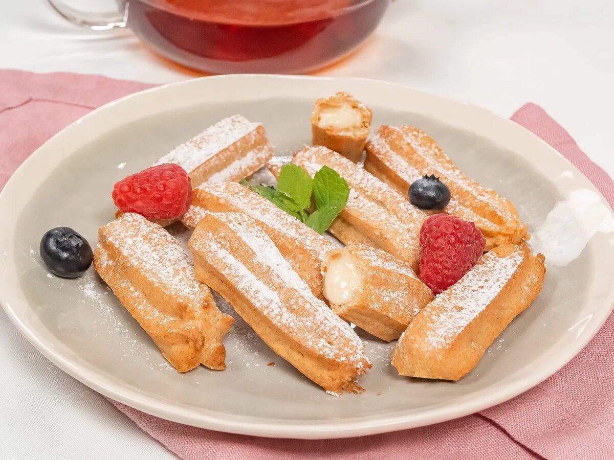 Приготовьте ароматные эклеры на цельнозерновой муке и наполните их нежным заварным кремом. Общий принцип приготовления теста для эклеров с цельнозерновой мукой — тот же, что и в классическом рецепте эклеров. Готовые пирожные получаются более плотными по структуре. Основная трудность в приготовлении заварного крема заключается в том, чтобы получить гладкую массу без комочков. Но если следовать всем пошаговым действиям, процесс будет простым. Продукты : Для теста Для крема и подачи Пошаговый фоторецепт : 1. Просейте муку, чтобы тесто было более легким после выпекания. Сливочное масло нарежьте кубиками и оставьте размягчаться при комнатной температуре — так тесто при замесе приобретет правильную однородную консистенцию. Включите духовку, чтобы она разгорелась до 200 градусов и смажьте противень для выпечки растительным маслом. 2. Приготовьте тесто из цельнозерновой муки. В кастрюлю налейте воду, добавьте масло, соль, поставьте на огонь и доведите до кипения. Перемешайте, добавьте муку и и