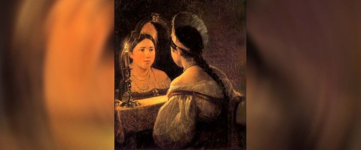 В полночь ушла в пустую комнату, поставила два зеркала: одно, большое, на столе, другое, маленькое, — напротив. Свечи зажгла, села за стол и начала шептать: