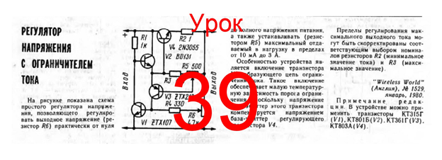И ещё два слова как происходит ограничение тока. Как только ток нагрузки достигает заданной величины, транзистор VT4 начинает открываться и тем самым подает на базу VT2 ток с эмиттера VT1 и транзистор VT2 открывается сильнее чем от задатчика напряжения R6, а резистор R3 предотвращает влияние потенциометра при максимальном выходном напряжении. Открываясь сильнее, транзистор VT2 снижает напряжение на базе VT1, снижая рабочий ток в нагрузке. Вот коротко об одном из самых лучших стабилизаторов с функцией регулировки тока нагрузки на транзисторах.