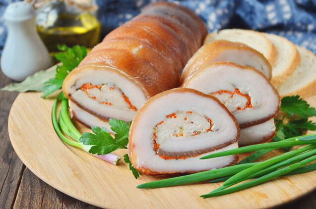 Чтобы приготовить этот рулет, необходимо взять сало вместе с его шкуркой. Лучше всего брать такой кусок, чтобы в нем была небольшая прослойка мяса. Кусок помойте, почистите шкурку и хорошо обсушите бумажными полотенцами. ШАГ 2: Обильно посыпьте кусок сала солью и специями. Можно использовать молотый черный перец и паприку. Несколько зубчиков чеснока необходимо очистить и измельчить. По всей поверхности сала разложите измельченный чеснок. Руками вотрите все специи в сало. ШАГ 3: Затем, после того как вы сделали все по вышеописанному, нужно свернуть сало в рулет вместе с шкуркой. После чего обмотайте рулет ниткой в несколько слоёв, чтобы он не разваливался. ШАГ 4: Рулет необходимо обе