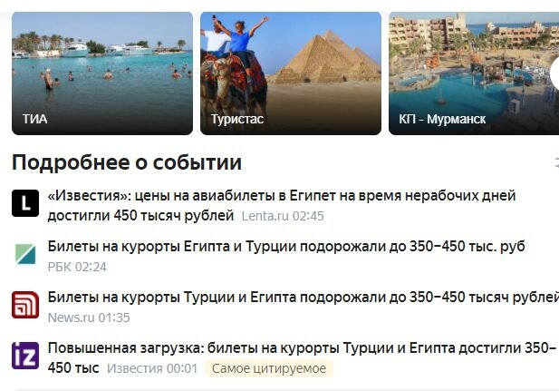 Ряд ведущих СМИ и информационных агентств страны недавно распространили сообщения о том, что билеты на перелёты по маршрутам, ведущим к излюбленным курортам россиян в Турции и Египте, в конце этого месяца подорожали баснословно, буквально в 10 раз. Было заявлено, что билет на самолёт прямым рейсом в Шарм-эль-Шейх может стоить 350 тысяч рублей. Да и хотелось бы увидеть того человека, кто согласится лететь в Египет за такую сумму. Но #СМИ упорно утверждают, что это правда и такие среди нас есть. Кто знаком с ценообразованием российских авиаперевозчиков, тот, конечно, знает, что при повышенном спросе все они поднимают цены, но не в десять же раз. Решил проверить самостоятельно, а можно ли улететь в Египет в эти большие нерабочие дни. Каково же было мое удивления, что сервис яндекс -Путешествия выдал сразу несколько вариантов перелёта на знаменитый египетский курорт, который когда-то называли всероссийской здравницей. Проверил ещё по трем подобным сервисам, но нигде нет даже и намёка