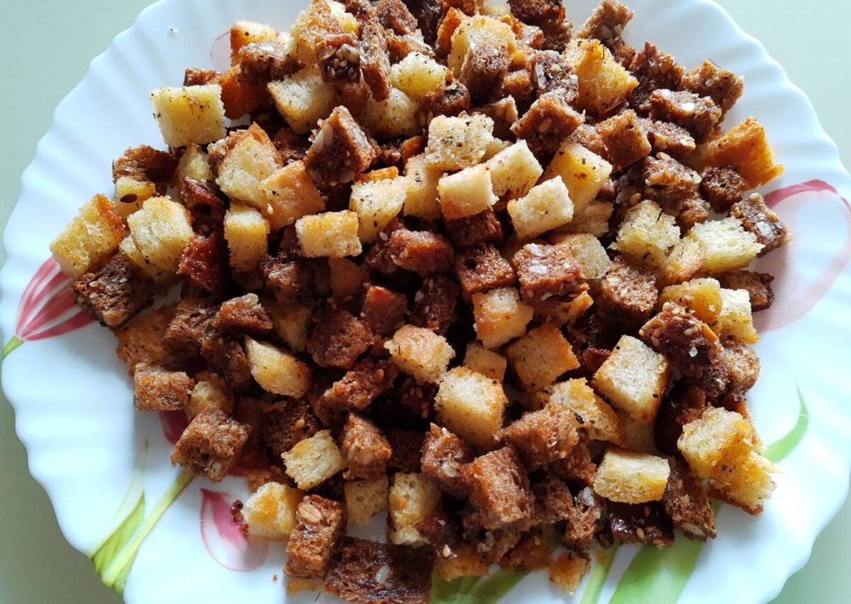 Здравствуйте! Бывает дома скапливается много хлеба, а выкидывать хлеб как мы знаем нельзя. Куда его девать? Голубям? Так они и так уже только пешком ходят. Вот предлагаю рецептик. Режем все остатки хлеба на одинаковые кусочки. Потом складываем все это дело или в два целофановых пакета или в чашку с крышкой, но только так чтобы место оставалось, нам ещё надо хорошенько потрясти все это дело. Сверху для пикантности пару зубчиков чеснока выдавливаем, немного копченой паприки, солим хорошенько и чтобы вся эта смесь прилипла к хлебу обязательно подсолнечного маслица. В случае с пакетом закручиваем верхушку что бы пакет был как бы надутым и начинаем активно, но без фанатизма перемешивать, так перемешивать что бы каждый кусочек хлеба обвалялся в соли, паприке и чесноке. В чашке делаем тоже самое. Духовка к тому времени должна быть уже разогретой. Вываливаем наши будущие сухари на противень равномерно распределяем и ставим в духовку. У вас минут двадцать есть за пивком сгонять. Достаем сухари