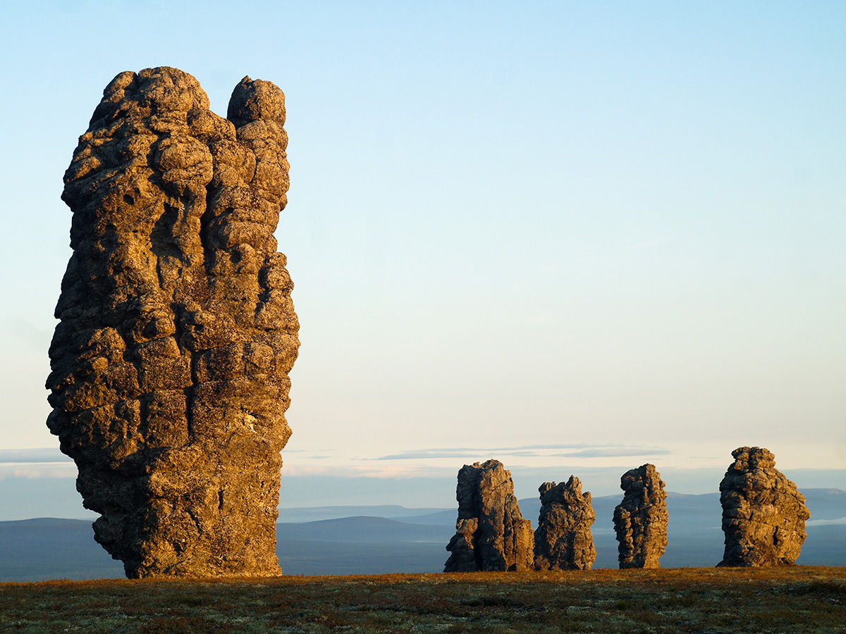 На северном Урале есть загадочное место, в котором из земли в небо возносятся удивительные столбы, называемые «мансийскими болванами». Находится оно в труднодоступной части Печоро-Илычского заповедника (Республика Коми), охраняется ЮНЕСКО и включено в список семи чудес России. Высота их меняется от 30 до 42 метров, а это величина 10-этажного дома. В общем, идолы Маньпупунёра — настоящие великаны! Официально это чудо природы на плато Маньпупунёр называют «Столбами выветривания». Столбы считаются геологическим памятником и природной достопримечательностью всемирного значения. Как появились Столбы выветривания? Несмотря на все местные легенды, ученые объясняют происхождение столбов на вершине плоскогорья эрозионными процессами. 200 миллионов лет назад гора Маньпупунёр была значительно выше. Однако ветер, солнце и осадки постепенно уносили с собой кусочки горной породы. В результате от вершины горы остались лишь 7 одиноко стоящих столбов. Народ манси считает, что на Маньпупунёре находится