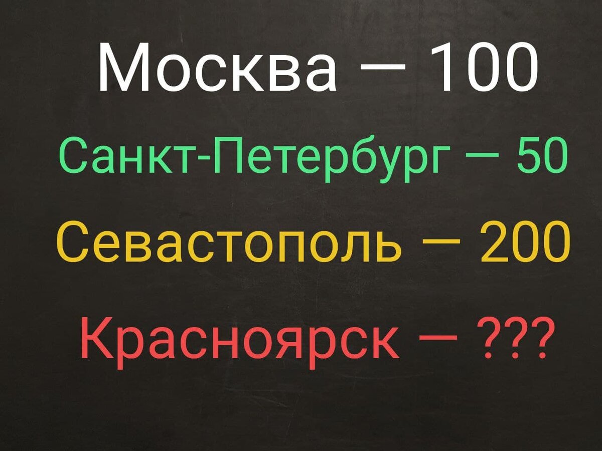 Интересную головоломку прислал один из подписчиков. Москва — 100; Санкт-Петербург — 50; Севастополь — 200; чему равен Красноярск?