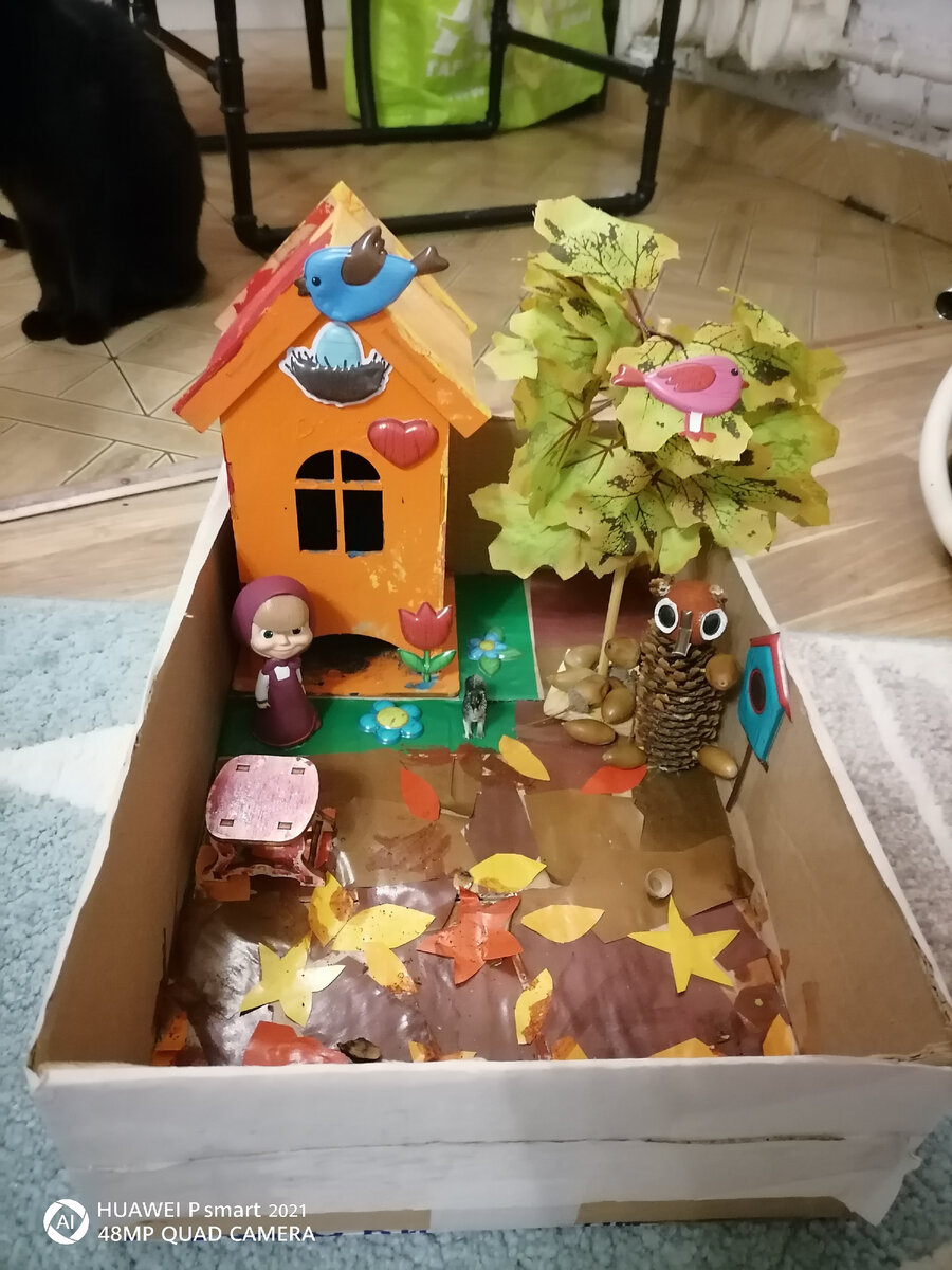 Подделку делали в самый последний момент. По скольку на улице дождь, листья мы купили в фиксе и намоиали эту листовую гирлянду на кинтайскуб палочку. Домик также купили и раскрасили, и наклейки с цветной бумагой нам очень помогли. Фиксик очень помог.