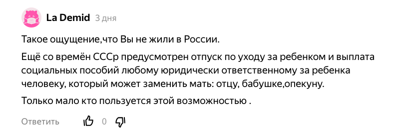 Не успела я написать про декрет для отцов в Дании(здесь) как тут же получила высокомерное замечание от читателя: В России есть отпуск по уходу за ребенком, который может брать кто угодно - мама, папа, бабушка...Могут брать, да, законом не запрещено. Но много ли вы знаете отцов, которые действительно берут отпуск по уходу за ребенком? И не потому, что жена сильно больна или умерла в родах, а потому, что она работает, а он - заботится о ребенке. Ну вот честно - много? Вот здесь я нашла статистику: всего в 2% случаев с младенцами сидят отцы. Причем в той же статье отмечается, что 39% мужчин хотели бы взять отпуск по уходу за ребёнком. Так почему же не берут? Думаю, первая причина - инертность мышления. Уход за младенцем считается женским делом, особенно потому, что женщина кормит грудью. Некоторые говорят, что женщина в декрете "восстанавливается после родов"- не думаю, "восстановление" с новорожденным на руках прибавляет матери здоровья. Впрочем, все женщины разные. И далеко не все ко