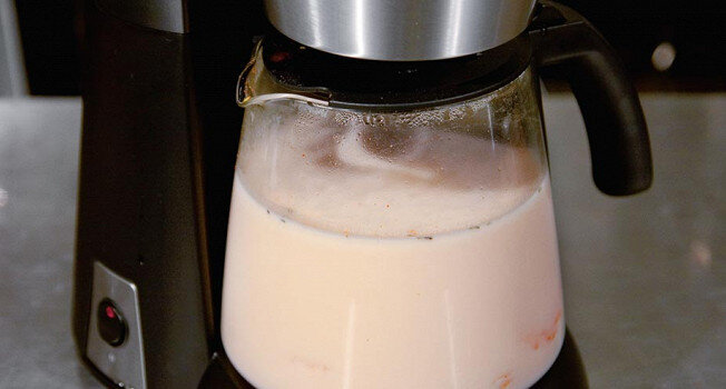 НА ОТФИЛЬТРОВАННОМ АРОМАТНОМ БУЛЬОНЕ У азиатских супов есть одна небольшая проблема: пряности делают бульон для супа ароматнее и аппетитнее, но многие из них решительно несъедобны сами по себе. Чтобы они не хрустели потом на зубах и не портили удовольствие, бульон после приготовления надо фильтровать. Мы решили сделать фильтрацию непосредственно во время приготовления, использовав прибор, который прекрасно с этим справляется: кофеварку. Конечно, суп варится несколько дольше, чем в кастрюле, зато его можно сварить и без плиты. Мы использовали кофеварку Moulinex Caprio. Отфильтрованный бульон капал с температурой 92-95 градусов. 1. Для супа нам понадобились креветки, лапша, кокосовое молоко, кофеварка, пряные овощи и специи. 2. Имбирь, корень сельдерея, лук и чеснок мы нарезали тонкой соломкой. 3. Нарезанные овощи, лимонную траву, розмарин, карри, гвоздику, перец и прочие мелочи положили в отделение для кофе. 4. В отделение для воды налили полтора литра холодной воды. 5. В стеклянную кол