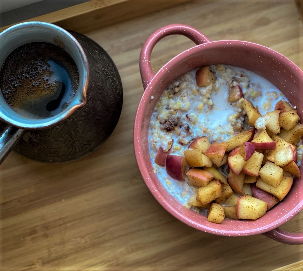 3 Добавляем карамелизированные яблоки к каше. При желании можно добавить мёд, шоколад или арахисовую пасту