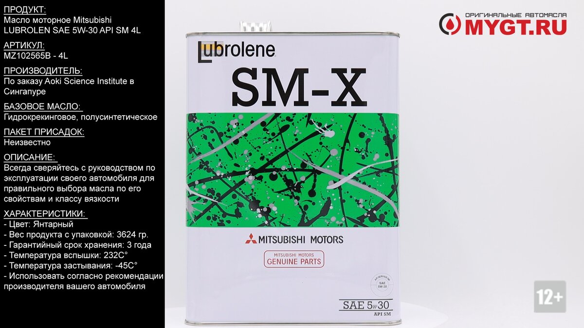 Продукт: Масло моторное Mitsubishi LUBROLEN SAE 5W-30 API SM 4L Наш телефон: 8-800-550-57-22 ПН-ПТ 9.00-17.00 (МСК+4) Артикул: MZ102565B - 4L Производитель: По заказу Aoki Science Institute в Сингапуре Базовое масло: Гидрокрекинговое, полусинтетическое. Пакет присадок: Неизвестно Ссылка для покупки: https://mygt.ru/Oil/selection/mitsubishi-lubrolen-sm-x-5w-30-4l--maslo-motornoe.html Моторное масло Mitsubishi Lubrolen SM-X 5w30 разработано для бензиновых двигателей GDI автомобилей MITSUBISHI с турбонаддувом и без. Моторное масло обеспечивает высокую степень защиты двигателя от износа, обладает отличными низкотемпературными характеристиками и высокими моющими и антиокислительными свойствами для двигателей японских автомобилей. Обеспечивает легкий запуск и надежную работу двигателя в тяжелых условиях эксплуатации. Высококачественное моторное масло Mitsubishi Lubrolen SM-X 5w30 позволяет увеличить интервал замены масла и обеспечивает высокую стойкость масляной плёнки при выс