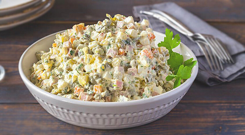 Первый вариант рецепта салата Оливье появился в журнале «Наша пища» в 1894 году. Версия предполагает наличие в составе каперсов и рябчиков. В следующих вариантах (1913 и 1984 годов) появляются салат-латук и соус соя-кабуль (пикантная заправка на основе мясного бульона, уксуса и различных овощей и кореньев). Однако питание гражданина Советского Союза не предполагало таких дорогих и редких ингредиентов, поэтому постепенно рябчиков вытеснила докторская колбаса, каперсы – соленые огурцы, а сою-кабуль — соус "Провансаль". Так и появился этот базовый рецепт — оливье по-советски, — на основе которого готовим его все мы. Ингредиенты: