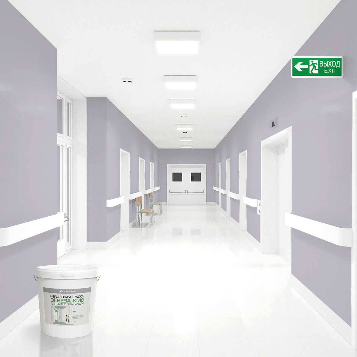 К отделке медицинских учреждений предъявляются повышенные требования с точки зрения безопасности. Помещения и пространства, в которых находятся пациенты, должны быть безопасны по всем параметрам. Коридоры и фойе поликлиник, больниц, госпиталей – это пути эвакуации, по которым в случае пожара люди будут покидать здание. Стены и потолки на путях эвакуации по требованиям ФЗ 123 «Технический регламент о требованиях пожарной безопасности» и СП 1.131130.2009 должны быть покрыты негорючими декоративными материалами. Следовательно, для коридоров таких учреждений должны использоваться только краски с маркировкой КМ0 (негорючие) с соответствующим пожарным сертификатом. Кроме того, к материалам на стенах больниц предъявляются повышенные требования с точки зрения гигиены: покрытия не должны содержать растворителей и токсичных веществ. А значит лучше всего для стен и потолков подойдут водоразбавляемые составы как наиболее экологичные и безопасные. При покупке негорючей краски для медицинских учреж