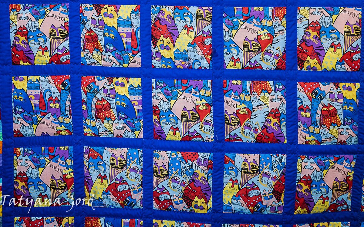 Вот шла себе мирно за очередной порцией синтепона, так ведь нет, глаз "зацепился" за котиков. Ведь котики - наше фсё!!!! Куда ж мы без них? А тут такие прикольные, и такая стая кошачья. Тем более, что к кошкам в Петербурге особое отношение. Вот и стала ваять, резать, шить, складывать, стегать. Но самое интересное началось в последний день. Дворик у меня маленький, почти колодец наш благословенный. Живём, как в коммуналке - всё слышно. И вот начинаю я стегать одеяло с утра, и слышу мяуканье. Со двора. Ну это у нас дело частое. Внимания не обращаю. А оно мяукает и мяукает за окном. Рядом на столе, на лоскутном моём одеяле про холодное лето 2015 года, валяется одно из двух моих богатств - Моисей Соломнович Швондер. Откликается на Моню, на Соломоныча, и на Швондера тоже откликается!!! Прислушивается к воплям, потом на пару с Марфой Васильевной они начинают скакать с окна на окно, а во дворе уже слышны вопли котов с соседнего двора!!!! Из полуоткрытого окна, мяучит молодая серая кошка, на